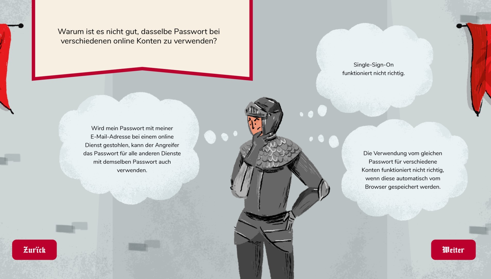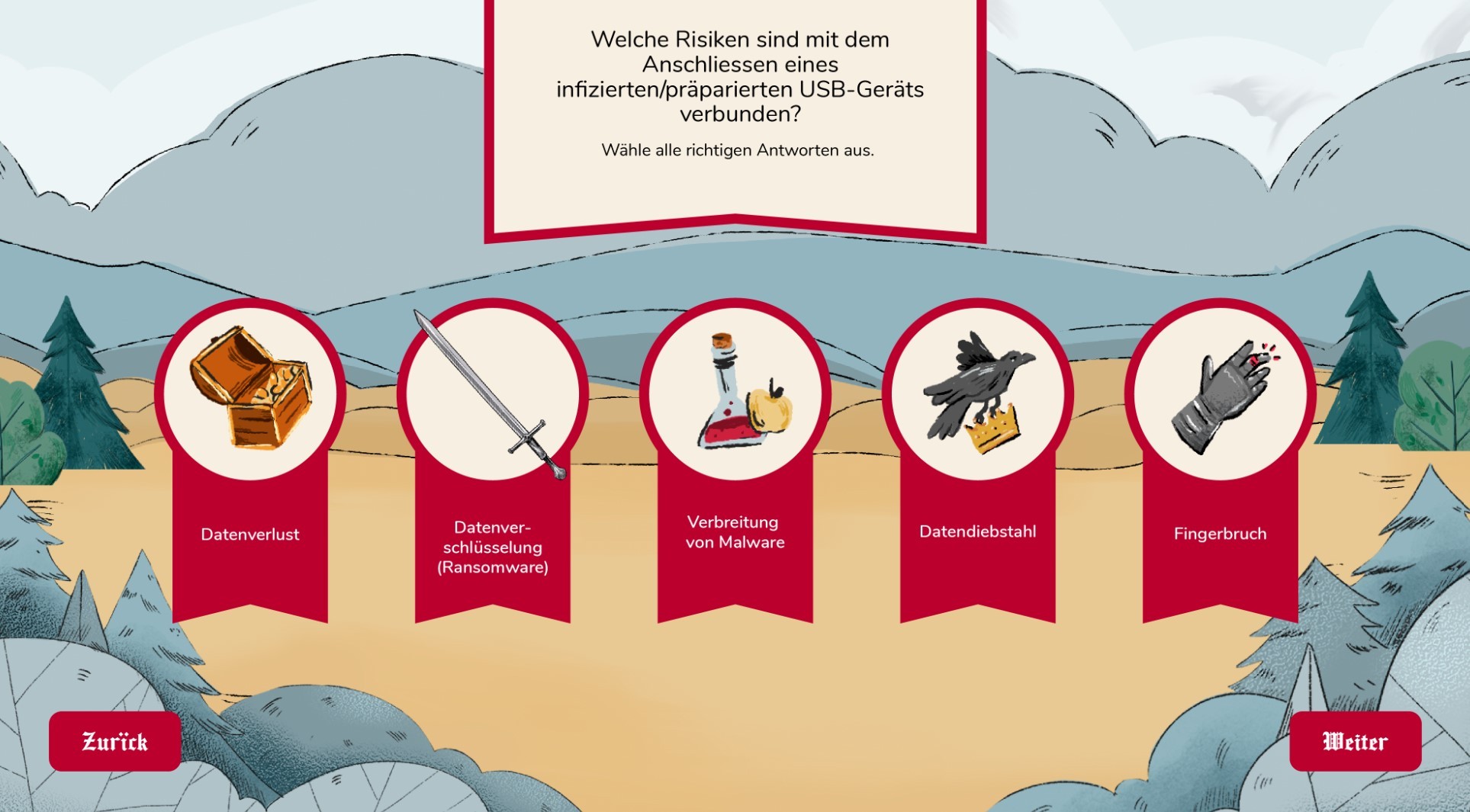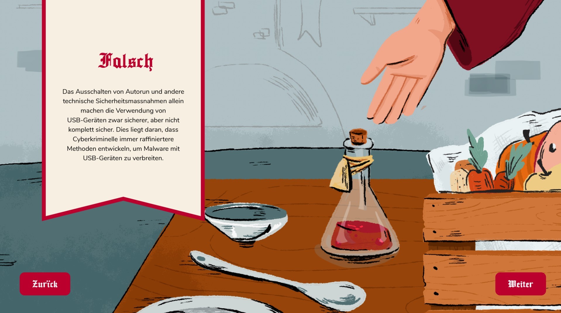 Um die vier Cyber Security Themen spannend und verständlich zu vermitteln, haben wir das E-Learning in eine mittelalterliche Welt verlagert. Dabei dienten uns Analogien aus der Zeit der Ritter und Burgfräuleins, um die modernen Gefahren und Schutzmassnahmen anschaulich zu erklären. Der USB-Stick wurden zu giftigen Tränken, Passwörter zu Schlüssel und Phishing-Anrufe zu Brieftauben.